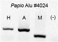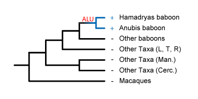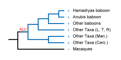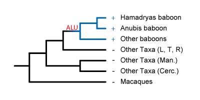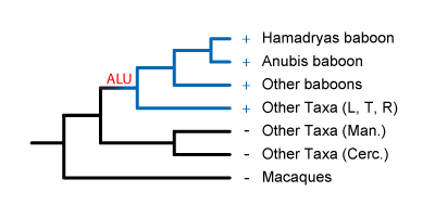 These potentially phylogenetically informative Alu elements can then be screened via PCR in the taxa that have diverged since the split with the outgroup. So an Alu found in a baboon sequence but absent in the macaque can then be screened in the African Papionins. The Alu above was originally found in the Hamadryas baboon and further screening via PCR showed it groups all the African Papionins.